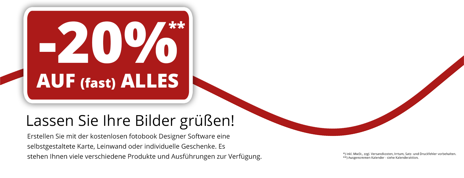 Mit unserer Herbstaktion können Sie 20%** auf (fast) ALLES sparen. Unsere Herbstaktion 2017 gilt auf alle Fotobücher, alle Wanddekorationen wie z.B. Leinwandbilder, alle Falt- und Grußkarten sowie auf alle Fotogeschenke wie z.B. Tassen und Puzzles.