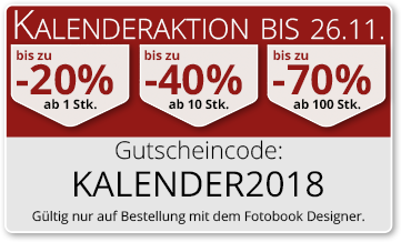 Die Aktion ist nur gültig, wenn bei der Bestellung von unseren Produkten der Gutscheincode SOMMER2019 eingegeben und eingelöst wurde. Der Preisnachlass wird nach dem Einlösen im Warenkorb direkt angezeigt und ausgewiesen. Keine Barablöse möglich. Pro Warenkorb und Bestellung kann nur ein Gutschein eingegeben und eingelöst werden. Der Gutschein kann im fotobook Designer und im Onlinedesigner angewendet werden. Diese Aktion ist nicht mit anderen Aktionen, Staffelpreisen oder Rabatten kombinierbar. Bei allen Wandkalendern ab 100 Stück und bei den Tischkalendern ist der maximale Rabatt bereits in der Mengenstaffel berücksichtigt.Gültig bis einschliesslich 08.09.2019.