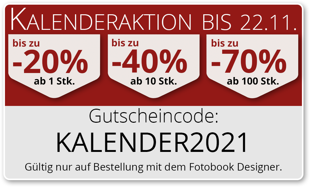 Die Aktion ist nur gültig, wenn bei der Bestellung von unseren Produkten der Gutscheincode SOMMER2018 eingegeben und eingelöst wurde. Der Preisnachlass wird nach dem Einlösen im Warenkorb direkt angezeigt und ausgewiesen. Keine Barablöse möglich. Pro Warenkorb und Bestellung kann nur ein Gutschein eingegeben und eingelöst werden. Der Gutschein kann im fotobook Designer und im Onlinedesigner angewendet werden. Bei allen Tischkalendern sowie bei allen Wandkalendern ab 100 Stück ist die maximale Rabattierung automatisch hinterlegt (Staffelpreis). Diese Aktion ist nicht mit anderen Aktionen, Staffelpreisen oder Rabatten kombinierbar. Die Aktion ist gültig bis einschliesslich 26.08.2018.